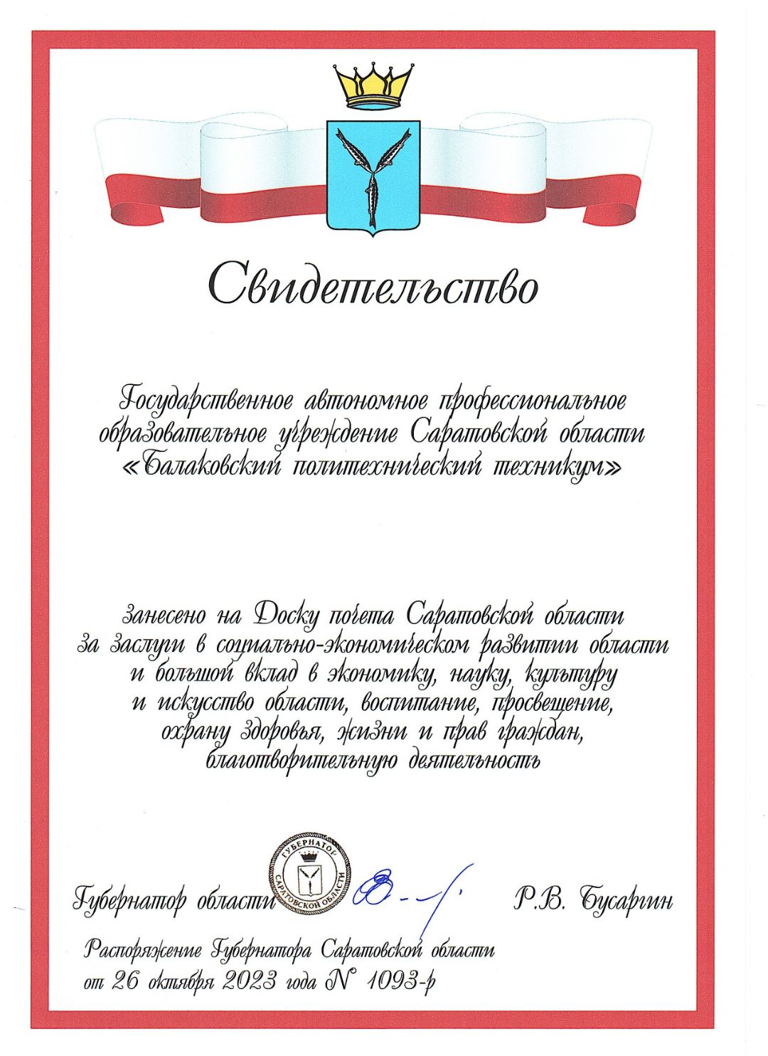 ГАПОУ СО «Балаковский политехнический техникум» занесен на Доску почета Саратовской области за заслуги в социально-экономическом развитии области и большой вклад в экономику, науку, культуру и искусство области, воспитания, просвещения, охрану здоровья, жизни и прав граждан, благотворительную деятельность.
